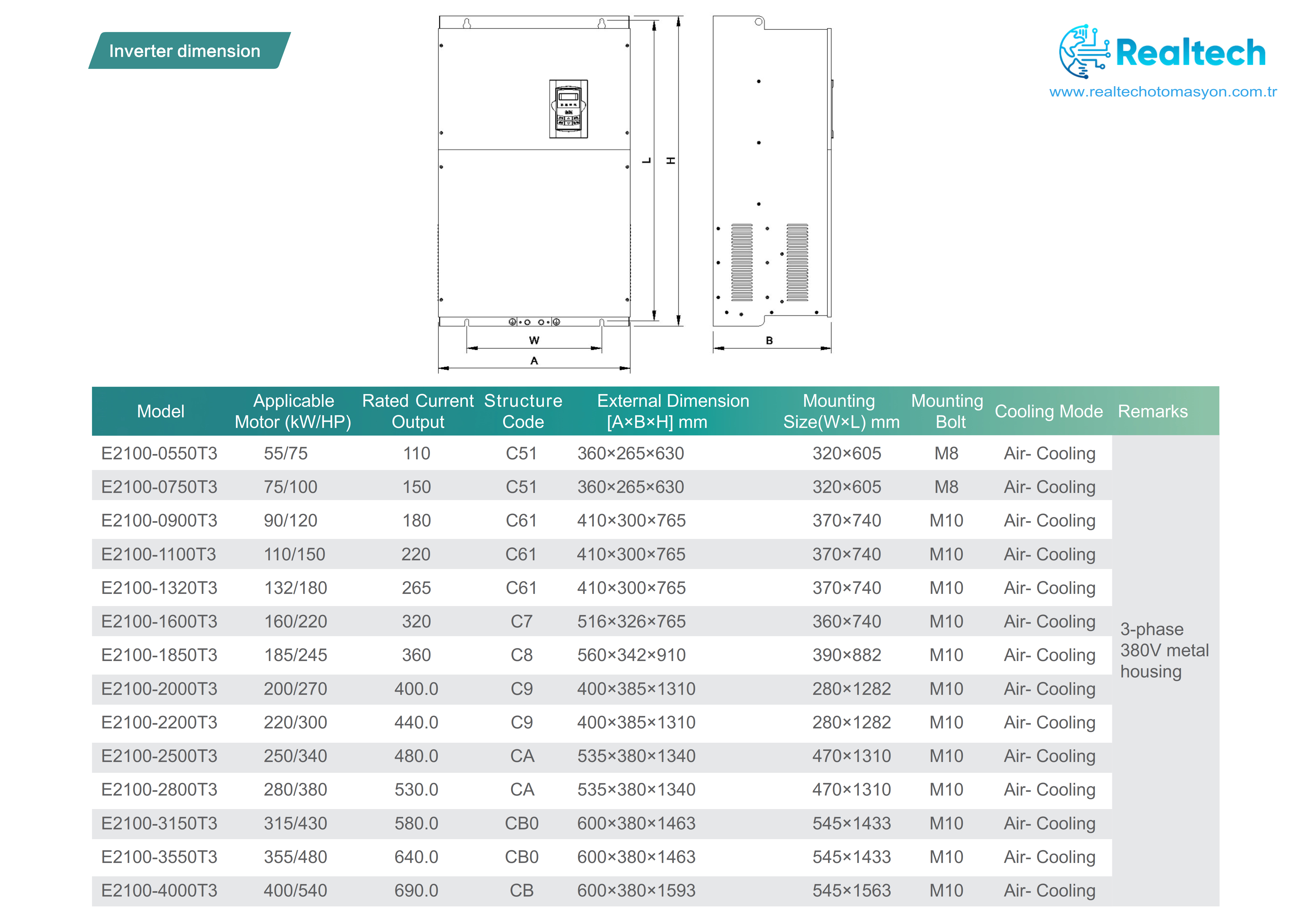 E2100 Serisi, dahili fren kıyıcı, emc filtresi ve üzerinde bulunan potansiyometre ile düşük güçlerden büyük güçlere kadar olan bütün uygulamalarınız için ideal çözümdür.